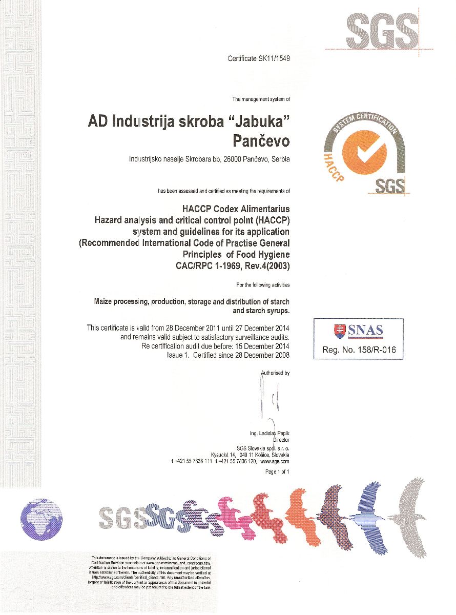 On December 15-th 2011. we had the HACCP system certification by SGS, for maize processing, production, storage and distribution of starch and starch syrups in Starch industry "Jabuka" Pancevo.