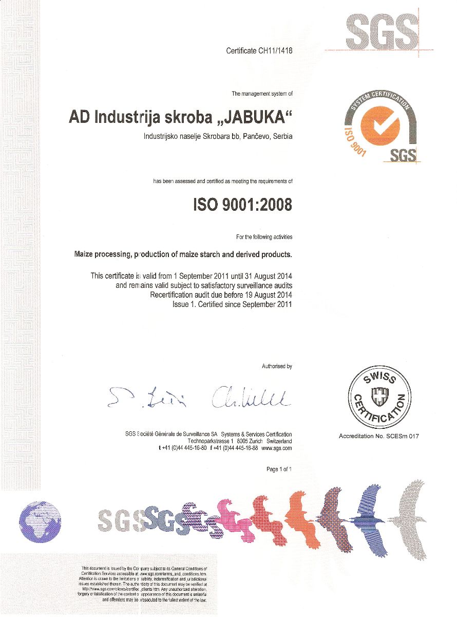 The menagement system of Starch Industry "Jabuka" on August 19-th 2011. has been assessed and certified as meeting the requirements of ISO 9001:2008. Certification has been performed by SGS; certificate is valid until August 31-st 2014.