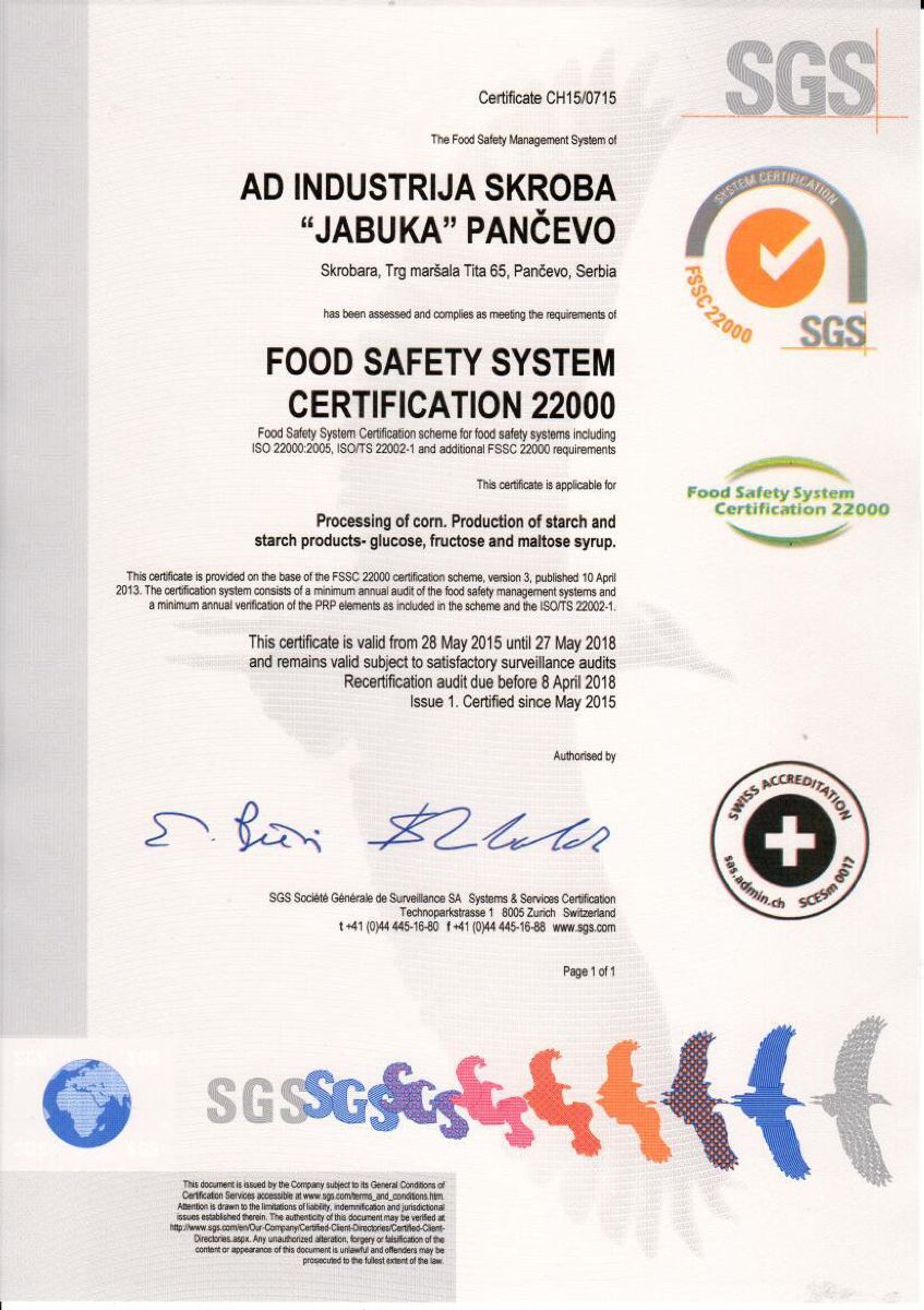 Sve svoje poslovne ciljeve "Jabuka" će ostvarivati primenom sistema obezbeđenja kvaliteta prema standardima ISO 9001:2015 i FSSC 22000 , koji podrazumevaju jedan proces neprekidnog poboljšanja poslovanja fabrike uz primenu i sprovođenje politike kvaliteta na svim nivoima.