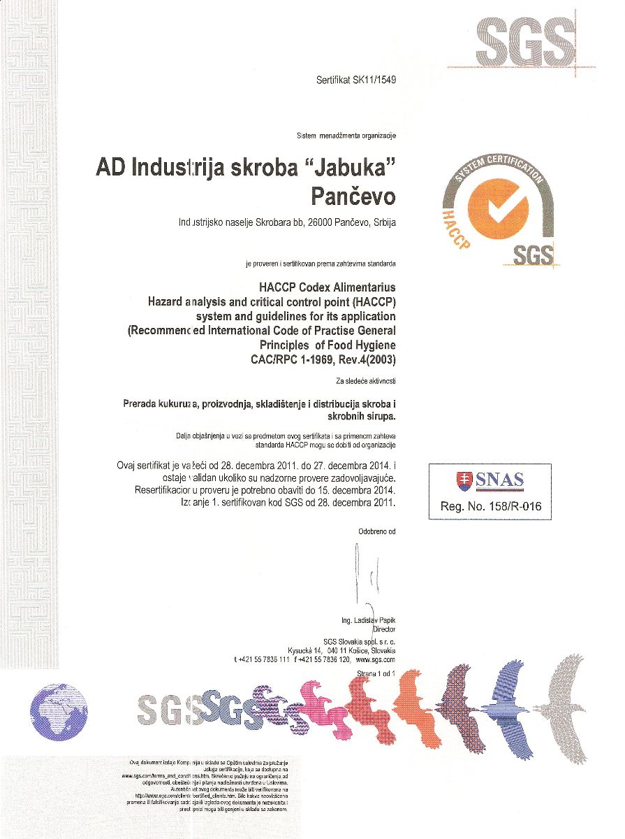 - HACCP sistem usaglašen sa REQUIREMENTS FOR A HACCP sistem BASED FOOD SAFETY SYSTEM 2002.